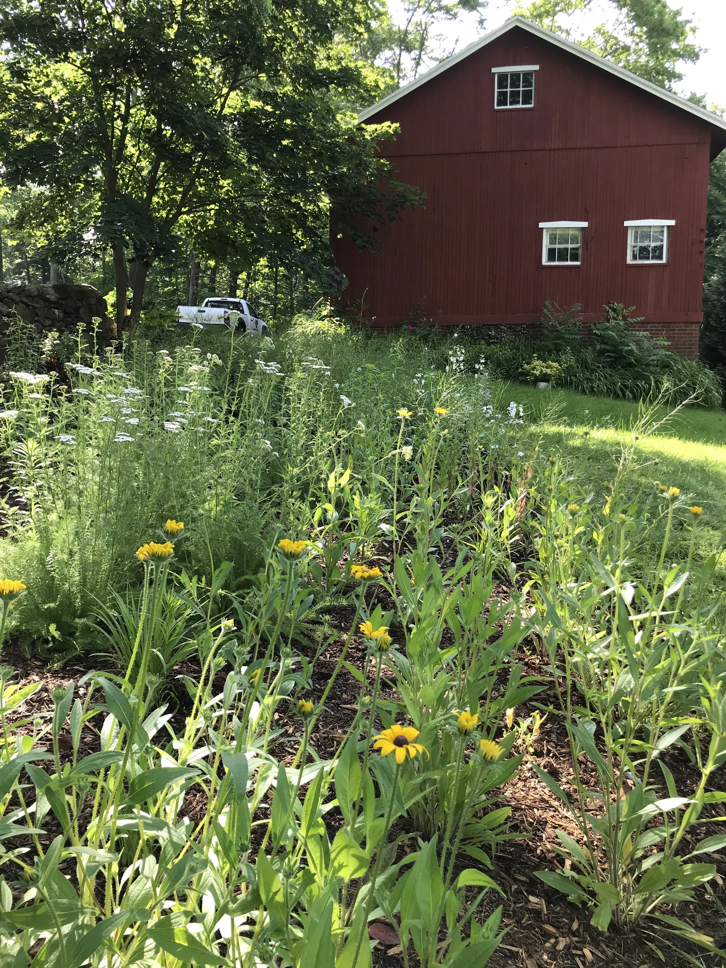 This client wanted to remove invasive plants under an existing canopy near his perimeter rock wall and replace it with a pollinator garden. We executed this with mechanical pulling, sheet mulching and smothering and then came back and planted perennials, shrubs, ferns and trees to create this habitat-rich pollinator garden with seasonal interest..